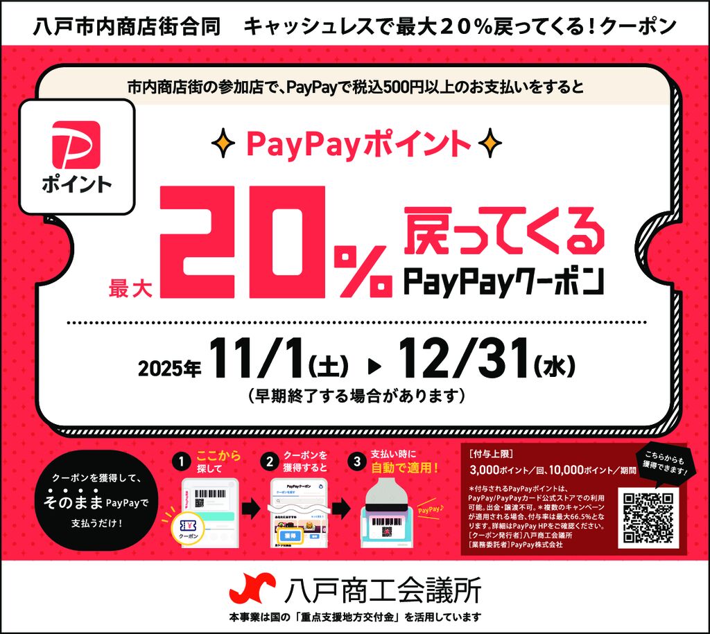 PayPayアプリからクーポンを獲得して、八戸市内商店街の参加店でPayPayで税込500円以上のお支払いをすると、最大20%のPayPayポイントを還元。